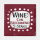 A funny typographic design that says "Wine: Can Recommend, 5 Stars". It's black and burgundy red text on a white rectangle with funky, playful white dots surrounding it, all on a burgundy background.