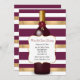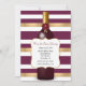 Wine themed party invitation done in a maroon, white and gold striped pattern, with graphics of a large red wine bottle. A decorative text area has custom text ready to personalise for your event.