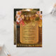 A romantic wine themed wedding invitation featuring grapes and peach coloured roses on a rustic wood wine barrel with artistic gold styled background, with festive string lights. On the back is your own photo as well as an easy to customise (or delete) QR code template.