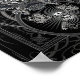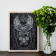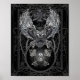 A powerful, winged owl soars above a skull adorned with keys. The owl is framed by intricate, swirling patterns, chains, and a Celtic cross. The monochromatic colour scheme adds to the image's dramatic atmosphere.