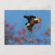 An eagles wing feathers shadow its face as it drops from a tree limb. Colourful out of focus leaves and tree buds add colour and interest.