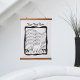 This tapestry with wood hangers has a black and white image of a white fluffy cat walking on the top of piano keys with bars of wavy music notes framed in a black with white dotted frame. Customise your text with the template.