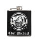 A cool and funny winking chef skull with crossed chef knives, against a black background. Add your name, for a personalised touch.