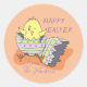A cute light orange round sticker featuring a cute winking chick hatching from a decorated egg . The text reads "Happy Easter" . Personalise it with your family's name . Perfect to use as envelope seals or to decorate presents .