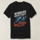 This black t-shirt features the motivational text "WINNERS NEVER QUIT" in bold white letters at the top and "QUITTERS NEVER WIN" in bold red letters at the bottom. The central graphic shows a runner, who appears to be a light-skinned individual, in motion with streaks of blue and red behind them, suggesting speed. The design promotes perseverance and a winning mindset.