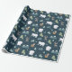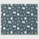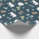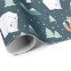 Winter animals pattern of white polar bears, forest deer, and forest fox, including mountains, pine trees and light snow on a dark blue background.