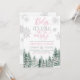 The invitation features snowflakes and evergreen pine trees with pink Christmas lights. This design is perfect for a winter baby shower for a girl.
