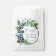 Winter baby shower editable thank you favour bags, watercolor dusty blue winter berries on snowy pine branches snowflakes thank you favour bags modern casual font