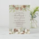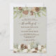 Winter pine cones and white flowers border the edges on a beige with elegant script wedding invitation.