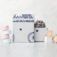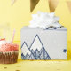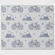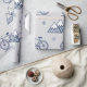The minimalist design features a delicately detailed bike and mountain range pattern in navy blue on a cosy grey background. Snowflakes falling from the sky and geometrically designed mountains blend harmoniously to capture the romance of winter travel.