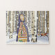 Try this colourful winter puzzle featuring a girl in colourful peasant costume and cloak, standing in a birch wood in the snow.