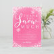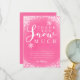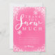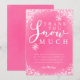 Cute winter snow theme birthday party thank you template card in pink featuring white glowing snow and snowflakes with a typography script text that says "thank you snow much." The editable message thanks guests for coming to the party and for the gift. Great for a girl's Christmas season 1st birthday.