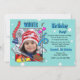 A fun invitation on a teal background with white polka-dots. The rectangular photo window is framed with images of winter items and is suitable for either gender. (FP)