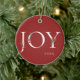 Winter botanical boughs, branches, and berries. Adorned "JOY", festive holiday red Christmas ornament.