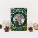 Subtle and elegant holiday photo cards feature a favourite photo in a unique round format, encircled by your custom holiday message (shown with "have yourself a merry little Christmas"), your names, and the year in white lettering. A hand drawn botanical wreath illustration surrounds your photo and text in shining gold foil. Add an additional photo to the back if desired.