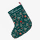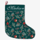 Add timeless charm to your mantel with this elegant personalized Christmas stocking featuring hand-painted winter botanicals, pine sprigs, berries, and dainty coquette bows on a deep evergreen background. The script name detail adds a refined, custom touch, while the festive red and green palette brings cozy holiday warmth to your décor. Perfect for pairing with matching wrapping paper, tags, and ornaments from the Winter Botanicals Collection.