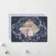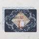 Elegant holiday photo card features a favourite photo surrounded by a geometric border of delicate blue botanical foliage and tiny watercolor flower blossoms on a navy blue background. "Joy and light" appears at the upper left corner in white lettering, with your family name at the lower right.