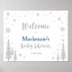 Winter wonderland baby shower welcome sign featuring cute snowflakes and the script text in silver glitter texture. Perfect for your winter themed baby shower.