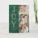 Festive holiday photo card featuring 3 of your favourite photos complimented by the word "Joy" in faux gold foil lettering and pine branches with snow against a green watercolor background. Personalise the holiday card by adding your names, the year, and custom message (on the inside).