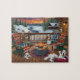 Winter Cabin Deck Dogs Fire Pit Snow Scene Jigsaw Puzzle