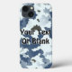 A white, blue and green, digital-style, winter camouflage pattern. Add your own text.