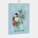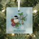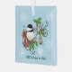 A chickadee perches on a snow-dusted tree branch in this winter illustration. Christmas holly and the little bird is surrounded by two holiday ornaments—one round and one teardrop-shaped—both adorned with festive patterns and rich seasonal colours. Snowflakes and snow falling all around in a backdrop of light blue.