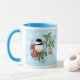 A chickadee perches on a snow-dusted tree branch in this winter illustration. Christmas holly and the little bird is surrounded by two holiday ornaments—one round and one teardrop-shaped—both adorned with festive patterns and rich seasonal colours. Snowflakes and snow falling all around in a backdrop of light blue.