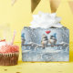 Two chickadee birds wearing cosy hats perch on snow-covered branches with a red heart hanging above them and surrounded by a winter landscape