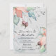 Inspirational scripture Winter Wedding Invitation depicts an elegant floral watercolor blush pink, salmon poinsettia with blue and green leaves, red berries and a blue abstract background rustic design. The back features a portion of Bible Verse Genesis 2:24, "And the Two shall become One." Good choice for winter, Christmas and holiday weddings.