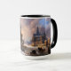This is a beautiful winter scene with fishing and house boats stuck in the harbour as the river has frozen over with people taking advantage of the frozen river to ice skate. In the background is a grand old Cathedral Church that looms large over the cityscape and a bridge that connects both parts of the city that the river runs through.