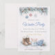 Winter gathering design featuring soft blue and ivory tones, pine garland with ornaments, and light snow texture. Detailed accents include lace-up boots, knit hat, and hot cocoa mug with candy canes. Script headline with clean layout suited for hosting a seasonal home party.