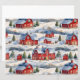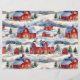 A beautiful winter pattern featuring a country winter scene with red snow covered barns.
