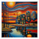 A.I. created interpretation of a vibrant landscape featuring swirls and circular patterns captures a surreal sunset over a wintry landscape of stylizes trees and a serene river.