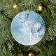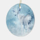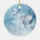 An ornament with an image of a majestic deer in wintertime. An icy blue filtered background gives this photo a cold winter look with a magical feel. This proud, noble animal stands on a hill with wintery pine trees off in the distance.