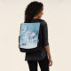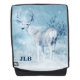 A backpack with your monogram initial(s). Designed with an image of a majestic deer in wintertime. An icy blue filtered background gives this photo a cold winter look with a magical feel. This proud, noble animal stands on a hill with wintery pine trees off in the distance.