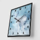 A clock with an image of a majestic deer in wintertime. An icy blue filtered background gives this photo a cold winter look with a magical feel. This proud, noble animal stands on a hill with wintery pine trees in the background.