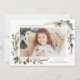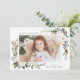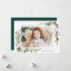 Elegant holiday card displaying your favorite photo on the front framed by bouquets of ivory watercolor flowers, lush green foliage, pine cones and holly berries. Personalize the front of the card by adding a custom greeting and your name. The back displays 3 more photos with space for the year, a custom message, and your family's names against a forest green background. Designed to coordinate with our Winter Floral holiday collection.
