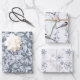 A trio of papers featuring a watercolor repeating pattern of pretty silver grey leaves on medium grey; dusky blue, tan and grey snowflake shapes on white and a beautiful bird sitting on foliage leaf strands set against a pale blue background. Ideal for all special wedding, birthday, anniversary and engagement parties.
