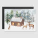 Celebrate the season with this elegant winter magnetic card. This design depicts a watercolor illustration of winter woodland scene - the fir trees, log-cabin, two deer and hare.