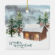 This design features an illustration of winter forest - pine trees, fox and log cabin, covered with snow