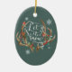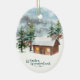 This design features an illustration of winter forest with log-cabin. On the reverse side - antlers, Christmas holly and snowflakes with the text inside "Let it snow"