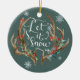 This design features an illustration of winter forests with log cabin. On the reverse side - antlers, Christmas holly and snowflakes with the text inside "Let it snow".