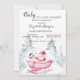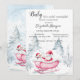 Cute baby shower invitation features winter forest with Santa Claus, and snowman on pink sleigh. These baby shower invitations are easily customised for your event by simply adding your details.