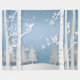 Striking papercut design in blue and white with trees, squirrels, and snowflakes.