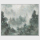 A foggy woodland mountain forest painted in watercolours with golden snow falling.