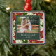 Elegant personalized Christmas ornament features your favorite horizontal or landscape oriented photo set on a background of vibrant red poinsettia flowers, green botanical foliage and tiny white blossoms. Personalize with two lines of custom text in ivory on hunter green for a unique addition to your holiday decor; shown with family name and the year.