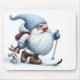 A whimsical watercolor bearded gnome with a winter hat is skiing with a cute bunny.