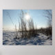 Sun shines behind tall grass in winter with a lot of snow in the nature from Spessart, Bavaria, Germany, with morning fog in the valley