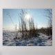 Sun shines behind tall grass in winter with a lot of snow in the nature from Spessart, Bavaria, Germany, with morning fog in the valley