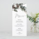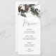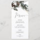 Celebrate in style with this rustic winter menu card featuring a watercolor pine and eucalyptus twig with cotton flowers and elegant handwriting calligraphy.